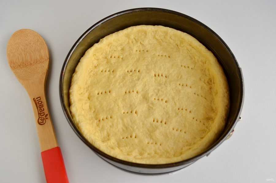 5. Форму застелите пергаментом, растяните руками тесто так, чтобы образовались небольшие бортики. Вилочкой сделайте проколы. Поставьте тесто в форме в холодильник.