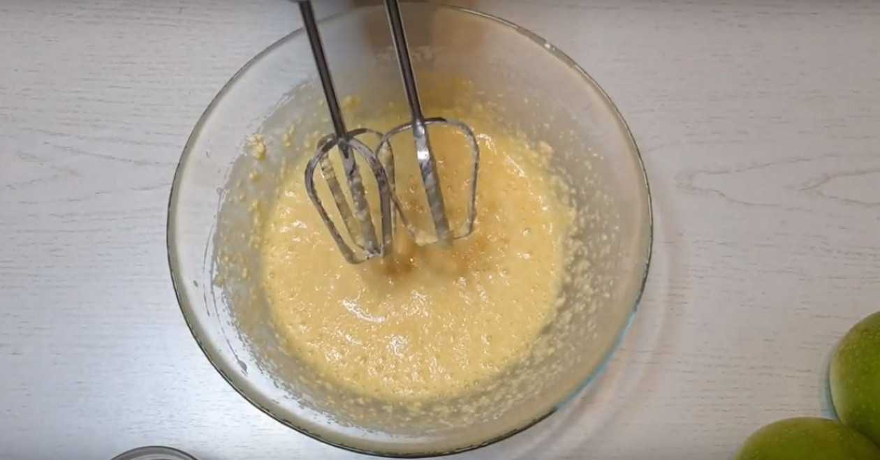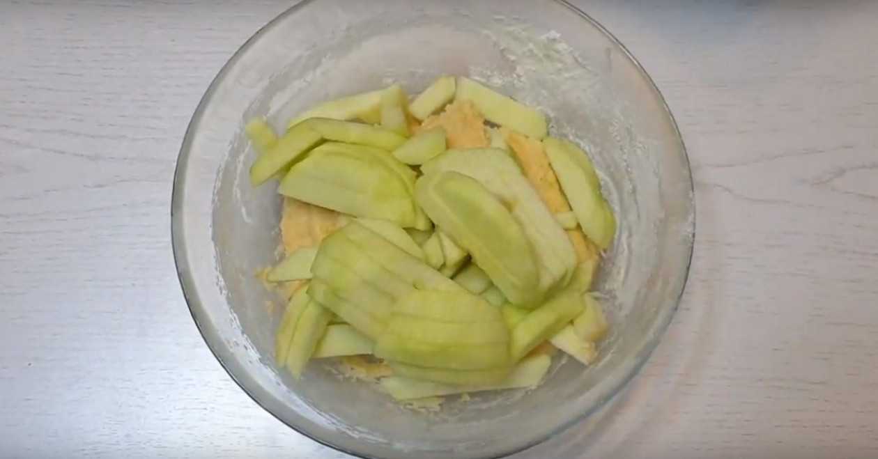 - С яблок сними кожуру. Нарежь продолговатыми ломтиками. Добавь полученные кусочки яблок в тесто и еще разок перемешай.