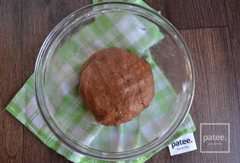 Завернуть кофейное песочное тесто в пищевую пленку и оставить на 10-15 минут в морозилке. Через это время раскатать толщиной 0,5 — 1 см.