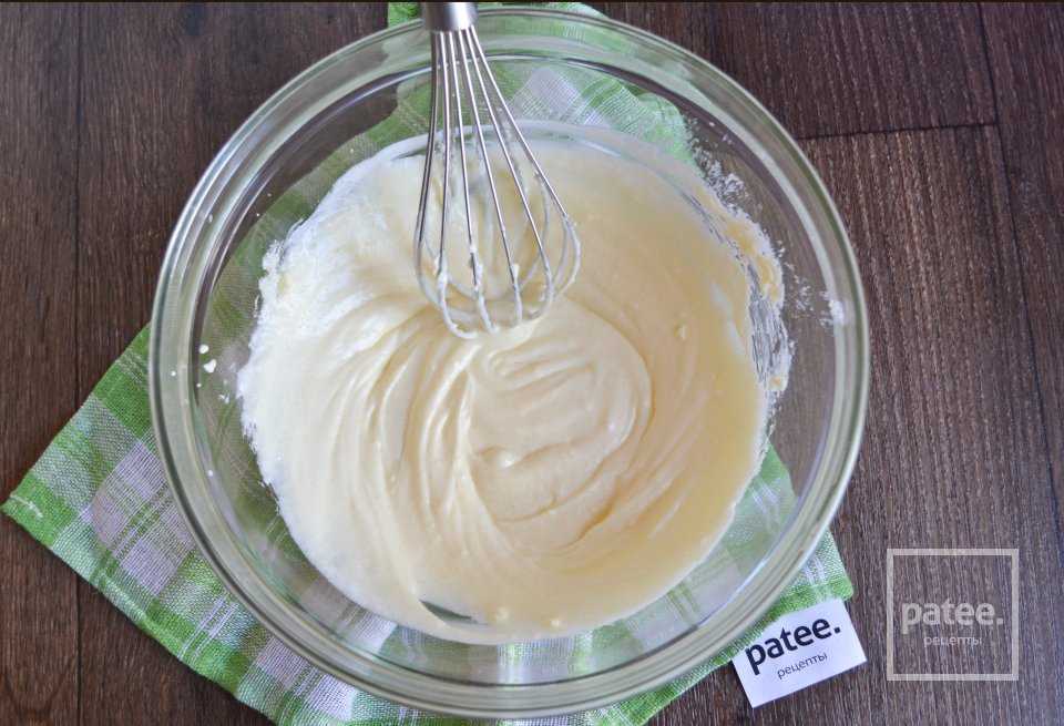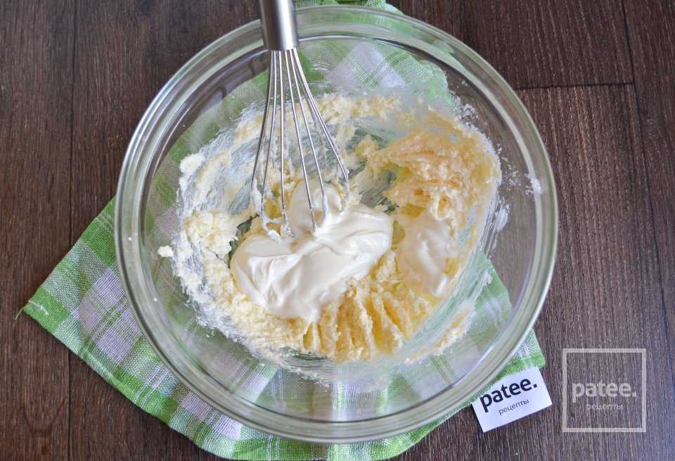 Добавьте сметану, лучше брать пожирнее, перемешайте венчиком.