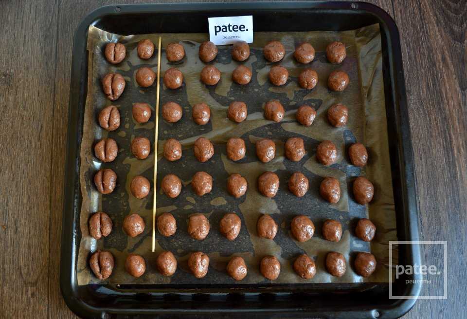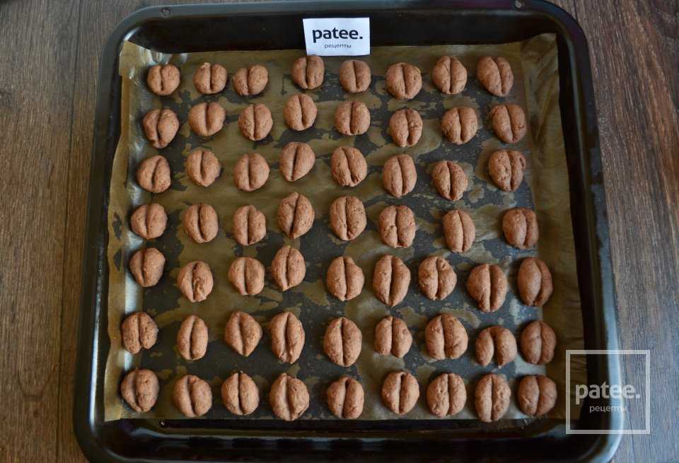 Духовку разогреваем до 180 градусов. Нарезаем тесто небольшими кусочками. Из них формируем овальные лепешки. Кладем на противень на расстоянии друг от друга. И обратной стороной ножа вдавливаем каждую лепешку по центру, чтобы получился неглубокий надрез, как у настоящих кофейных зерен.