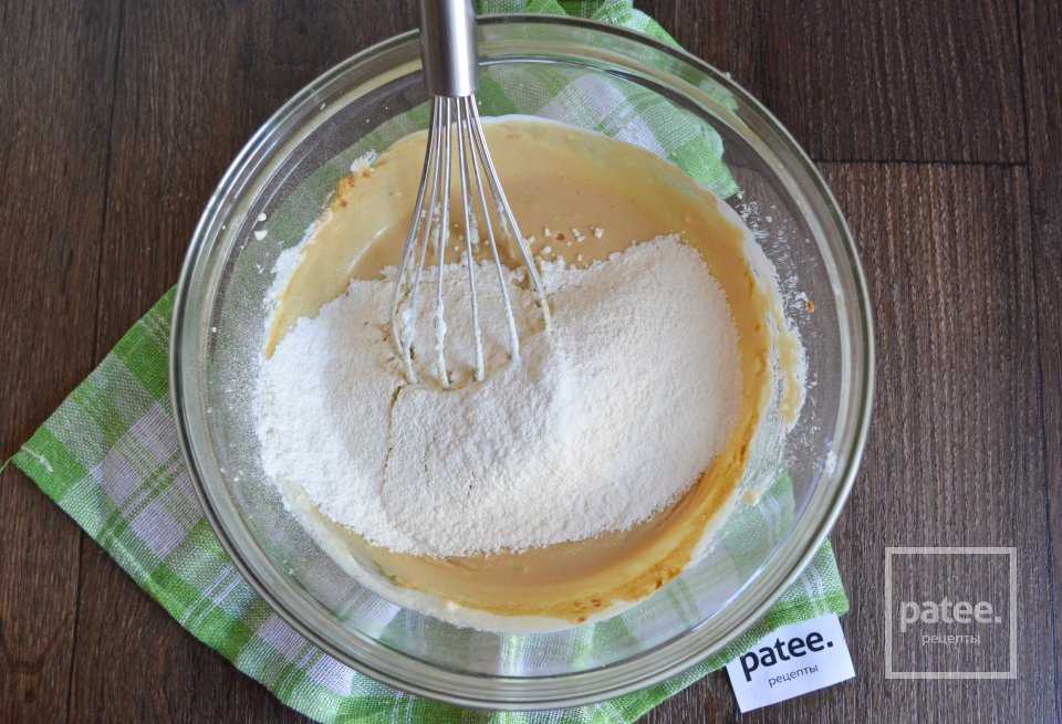 К мучной массе добавила приготовленную пудру (не всю, 6 столовых ложек) и соль (лучше использовать мелкую). Уровень сладости вы можете варьировать по собственному усмотрению. Я, как и всегда, кладу сахара/пудры меньше, чем в стандартных рецептах. Тщательно перемешала все сухие ингредиенты и сделала в центре углубление.