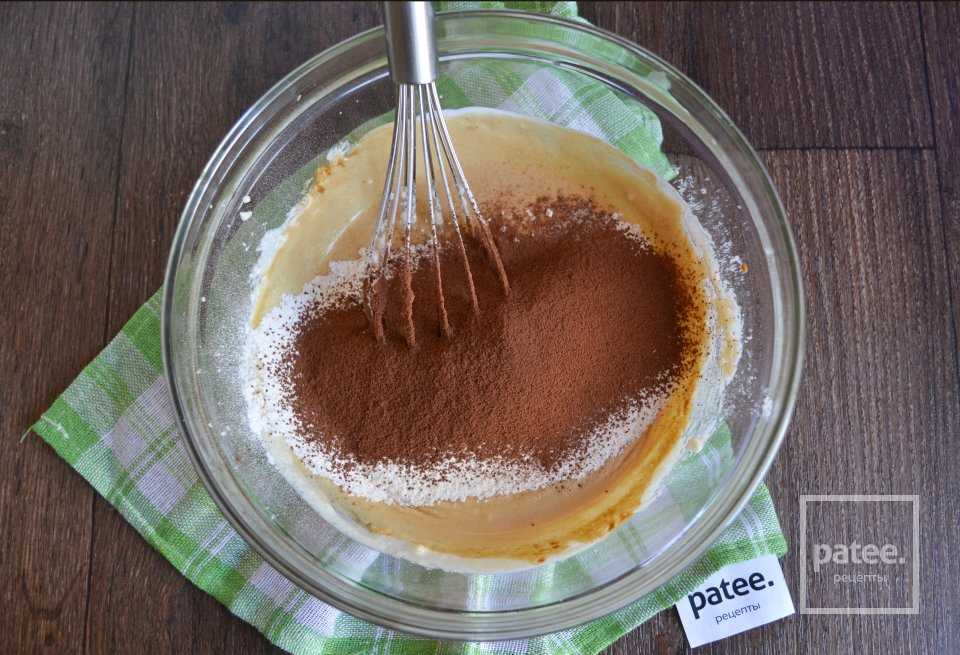 Туда же добавьте просеянное какао, и начните замес теста, по надобности нужно добавить еще муки. Долго не месите, просто перемешивайте до соединения всех ингредиентов.