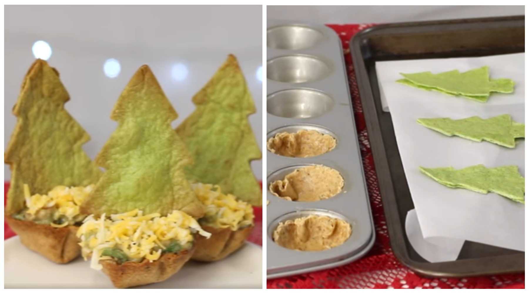 Берут два тонких лаваша. Пшеничный и с добавлением зелени (шпината). Второй по виду светло зеленый. Из пшеничного вырезают кружки. Укладывают в формы для кексов. Запекают в духовке. Тут же запекают до хруста елочки, вырезанные из шпинатного лаваша. Для них используют мелкие формочки для печений в виде елочек. Сборка закуски занимает минимум времени. В тарталетку из лаваша укладывается ложка любого майонезного салата. В центр вставляется елочка. У основания посыпается тертый сыр. Как вам рецепт?