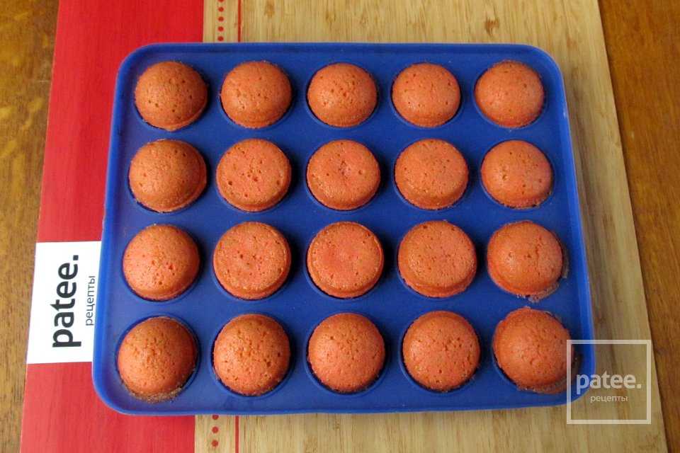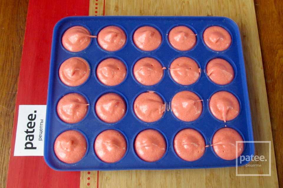 Итак, отсаживаем (или ложечкой раскладываем) тесто в полусферы на планшете. Из предложенного в рецепте количества ингредиентов в итоге получится 20 кейк попсов, как раз для одной формы с двадцатью выемками размером 4 см каждый.