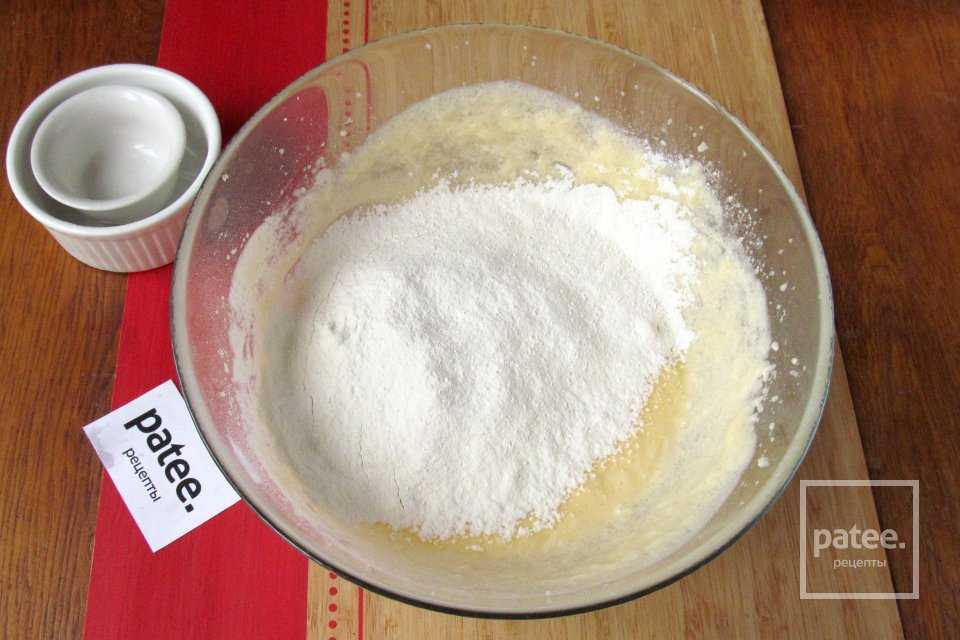 Просеянную муку соединить с разрыхлителем и добавить частями к масляной смеси. Возможно, муки понадобится еще 1 горсть.