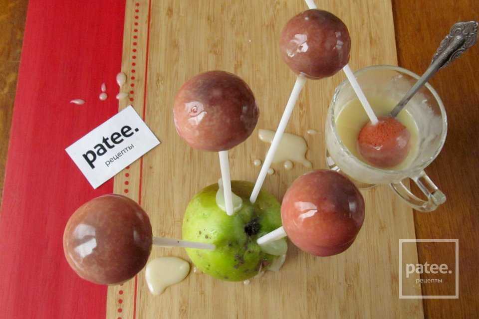 Когда палочки с шариками теста надёжно зафиксируются, окунаем шарик в шоколадную глазурь, которую следует повторно растопить до нужной консистенции. Окунаем шарик на палочке в глазурь, приподнимаем, вращаем, чтобы глазурь покрыла поверхность равномерно, а остатки шоколада стекли в ёмкость.