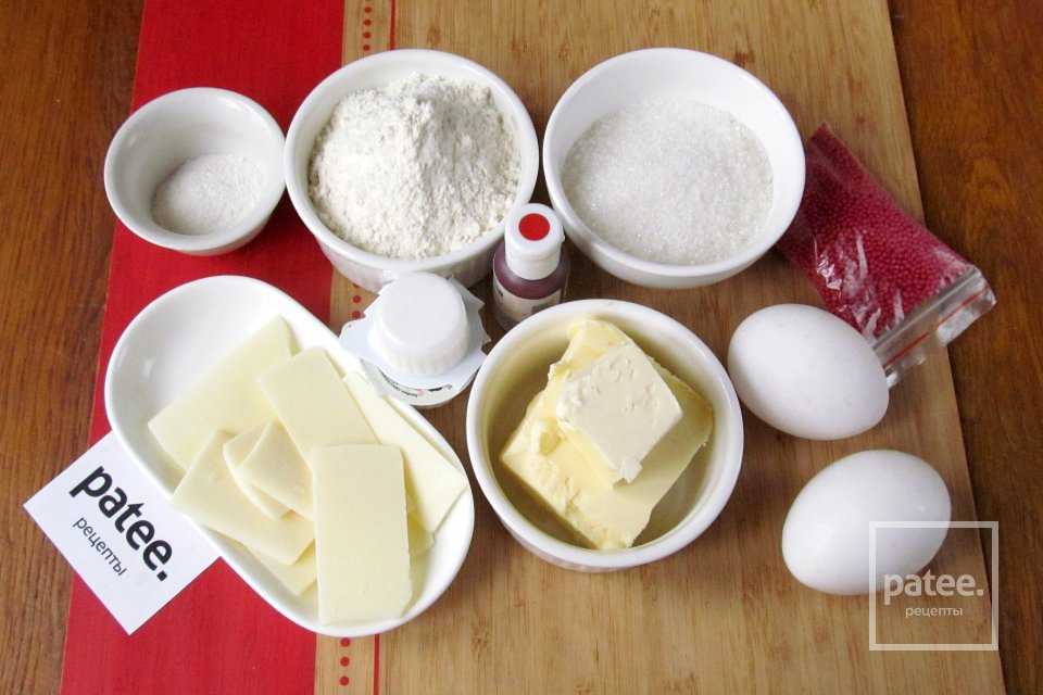 Для приготовления кейк попсов “Красный ”бархат» нам понадобятся следующие ингредиенты: мука пшеничная, разрыхлитель, куриные яйца, сливочное масло, сахар, белый шоколад (или глазурь), сливки 10%, красный пищевой гелевый краситель, кондитерские посыпки.