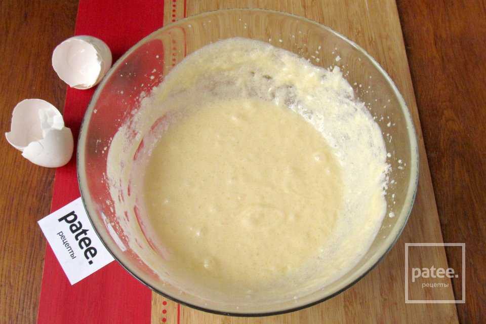 В получившуюся смесь всыпаем просеянную с разрыхлителем пшеничную муку. Замешиваем гладкое шелковистое тесто, по консистенции похожее на тесто для классического кекса.
