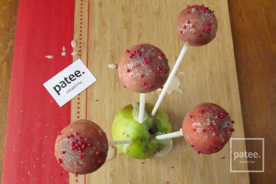 После того, как шарик теста в шоколаде был посыпан сахарными украшениями, устанавливаем его вертикально на кусок толстого пенопласта или в посуду с насыпанной крупой для устойчивости, вонзаем в большое яблоко или используем специальную подставку для кейк попсов.