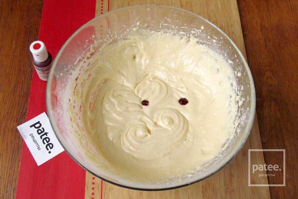 В получившееся тесто добавляем пару капель красного гелевого пищевого красителя. Если вы используете сухой краситель, то его предварительно нужно будет развести с помощью небольшого количества кипячёной воды.