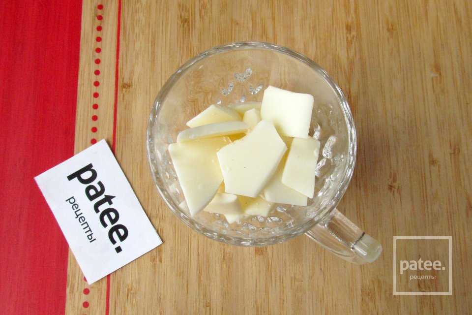 Для глазури белый шоколад измельчаем в крупную крошку и перекладываем в удобную посуду (стеклянную чашу, пиалу, стакан).