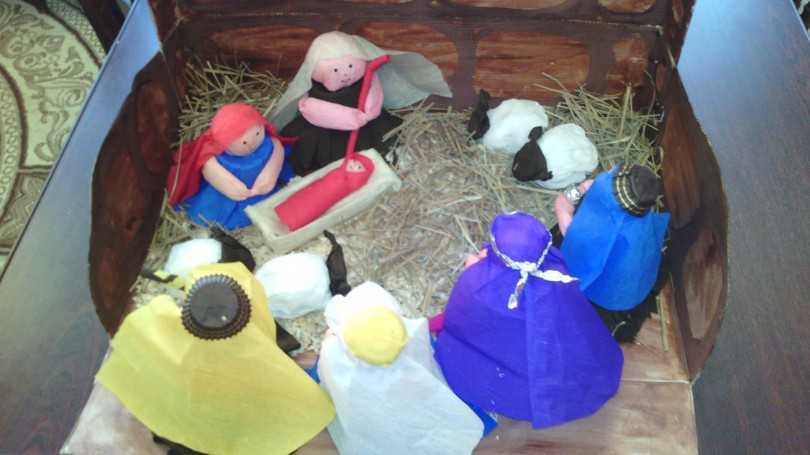 Можно также склеить основу из бумаги, установить деревянный забор. Вариант – сделать задний фон вертепа из кубиков или конструктора и задрапировать тканью.