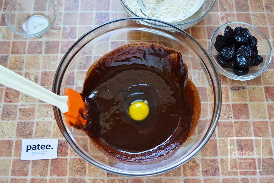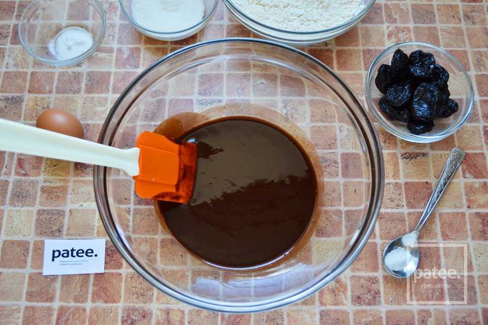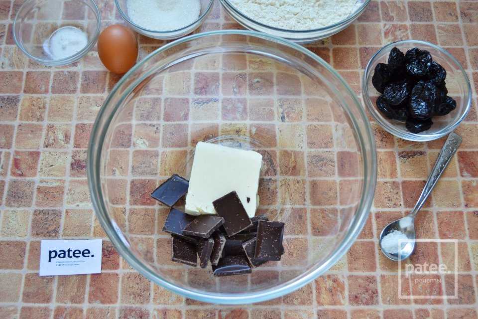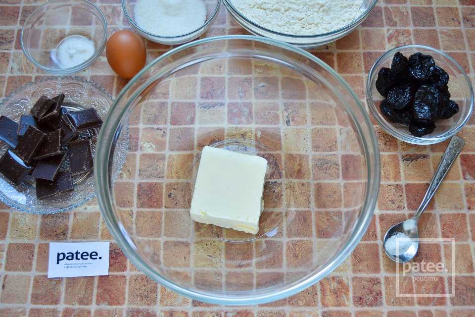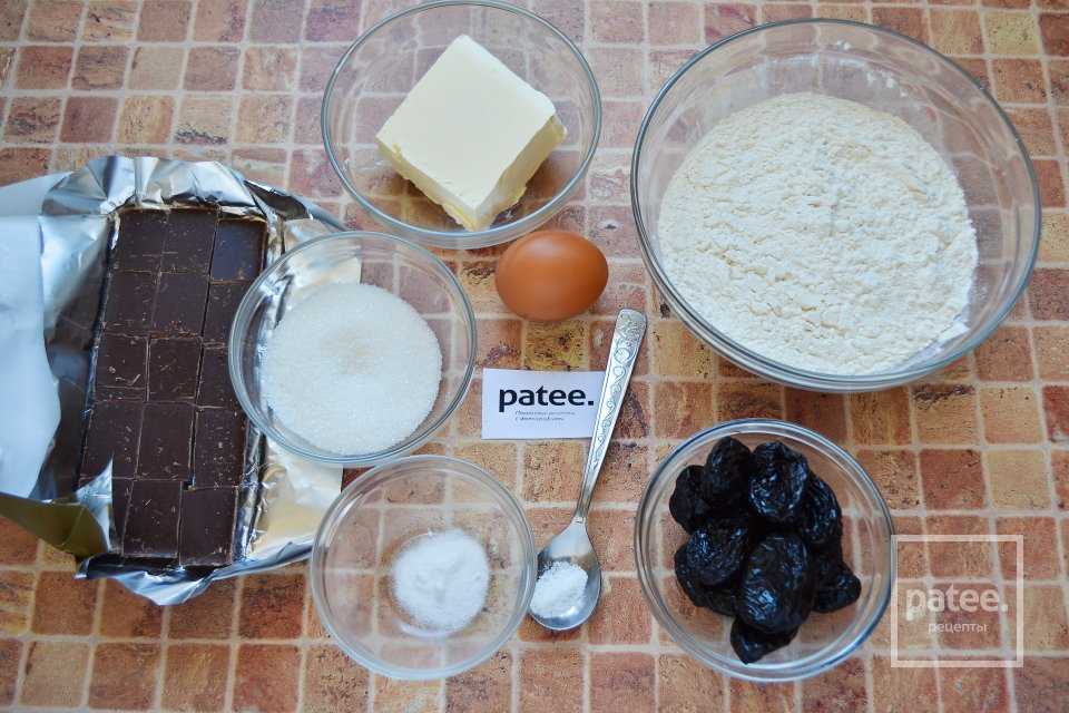 Для приготовления этого чудесного печенья вам понадобиться: шоколад, яйцо, масло сливочное, мука, сахар, разрыхлитель и чернослив.