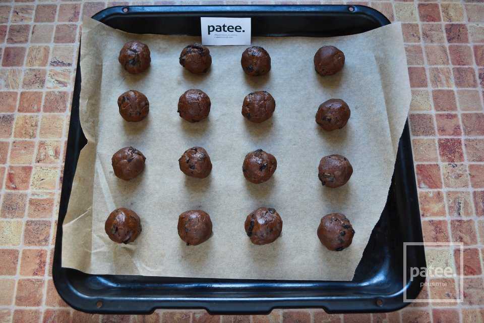 Противень для запекания застилаем пекарской бумагой и переходим к приготовлению печенья. Готовый тестовый шар делим на 20 — 30 частей и из каждой части скатываем небольшие ровные шарики. Затем берем один шарик, делаем углубление и закладываем туда чернослив, после этого аккуратно защипываем края, придавая ему снова красивую ровную форму шара.