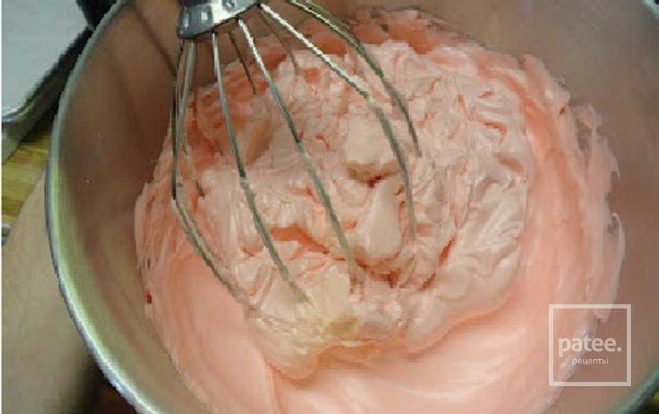 Венчиком или миксером сбивайте яичные белки с солью и яичным порошком(если вы таким пользуетесь). Начинайте медленно, потом быстрее по мере загустения белков. Добавьте сахар-песок и пищевой краситель. Сбивайте, пока яичные белки не образуют густую пену и ваше безе станет крепким и светлым.