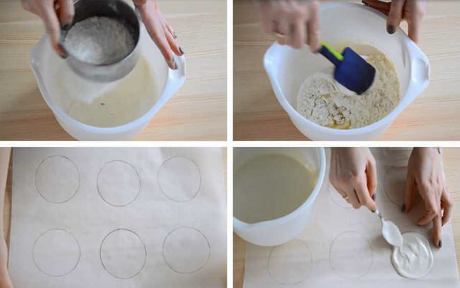 - На противень расстелите пергаментную бумагу и начинайте выливать на него тесто по 1 ч. ложке, формируя из него круги диаметров 8 см. Выкладывает его нужно на расстоянии, лучше за 1 раз не выпекать больше 4 штук.