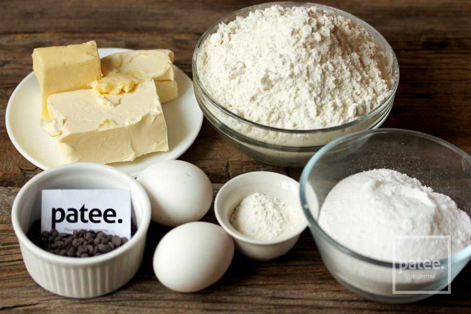 Для приготовления мягкого печенья с шоколадными каплями нам понадобятся следующие ингредиенты: пшеничная мука, сливочное масло, куриные яйца, разрыхлитель, сахарная пудра, шоколадные капли.