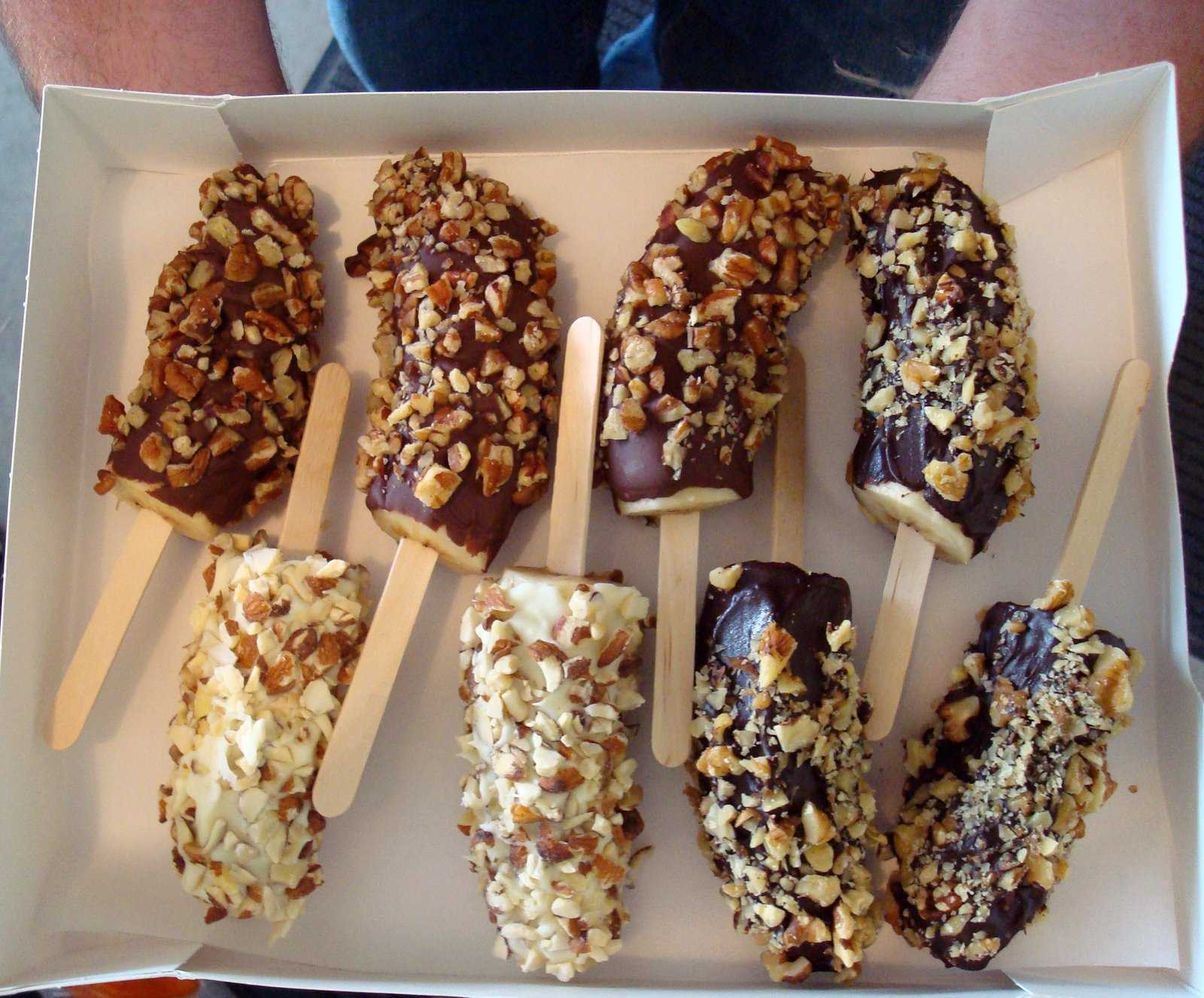 - Насыпьте арахис в неглубокую посуду или на тарелку. Растопите шоколад на водяной бане над слегка кипящей водой, часто его помешивая. Убедитесь, что вода не касается дна верхней миски. Перелейте растопленный шоколад в высокий стакан. Окуните каждый замороженный банан в шоколад, повернув, чтобы покрыть его, и сразу же обваляйте в арахисе. Положите на поднос, застеленный вощёной бумагой. Сразу же подавайте или заверните по отдельности в пищевую плёнку или вощёную бумагу и храните в морозильной камере до 2 недель.