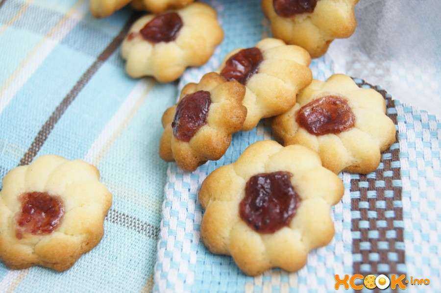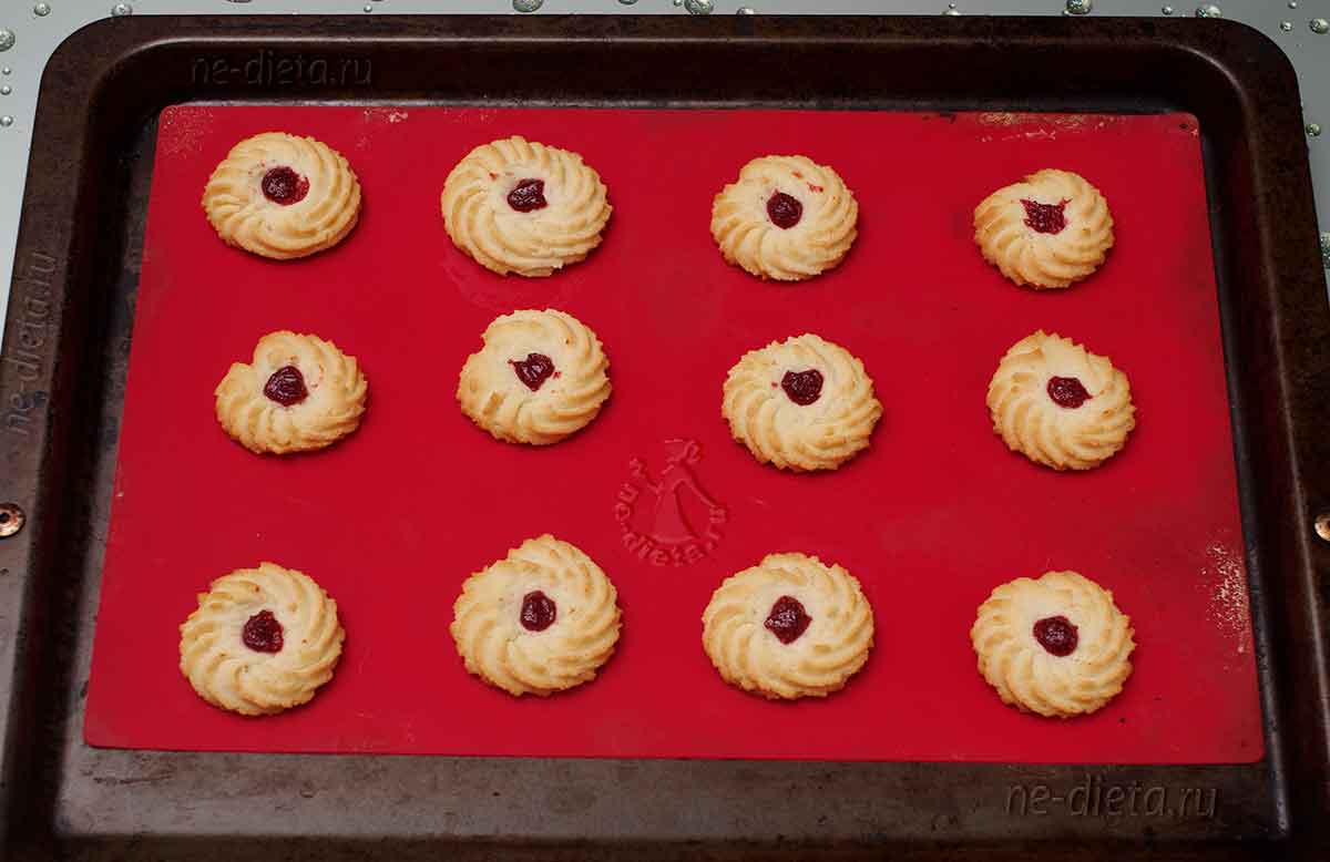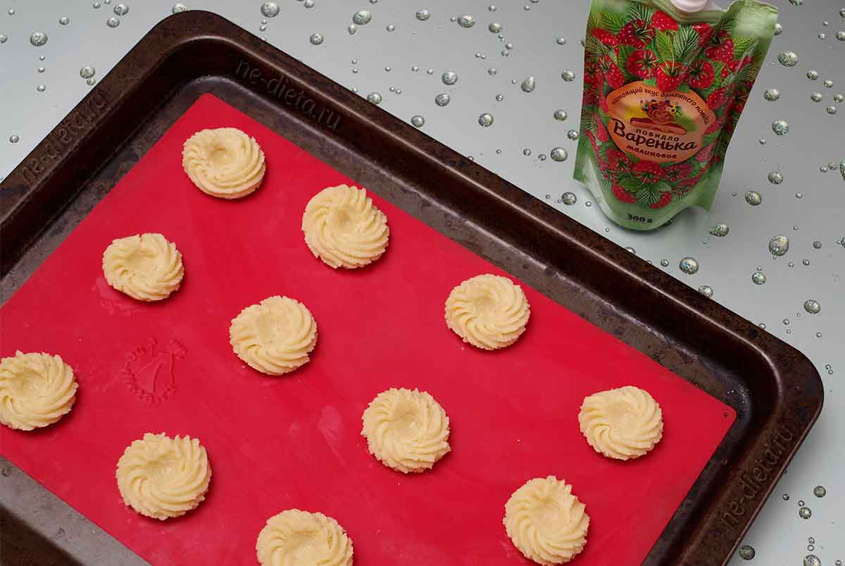 Совет! Поскольку само печенье получается достаточно сладким, то лучше использовать для него джем с выраженной кислинкой, например, хорошо подойдет вишневый, малиновый или сливовый. Я предпочитаю покупать джем или повидло в мягком пакете, так как его легко выдавливать из специального дозатора прямо на печенье. Если у вас в наличии есть только варенье или не очень густой джем, то в такой продукт надо добавить немного крахмала, иначе скорее всего он растечется в процессе выпекания.