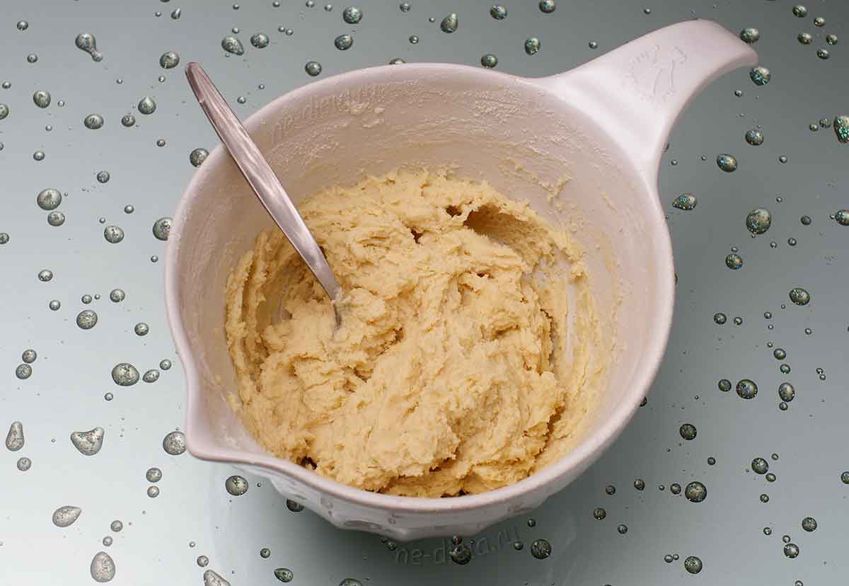 К сладкому уже маслу небольшими порциями добавляйте просеянную муку и тщательно перемешивайте до однородной массы. Возможно, муки потребуется чуть меньше, чем указано, или чуть больше (это зависит от ее качества). Определить это необходимо по состоянию теста: оно должно быть мягким, пластичным.