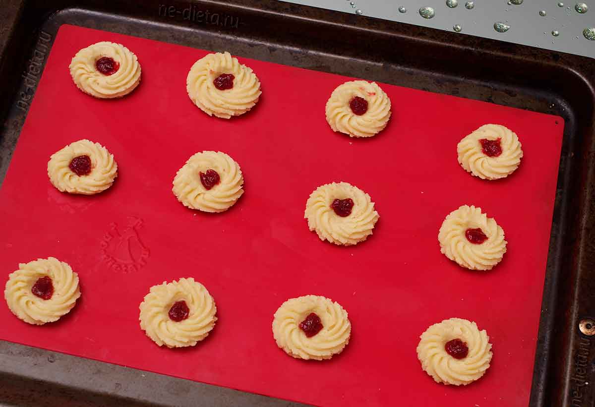 Готовое тесто поместите в специальный кондитерский мешок. На него наденьте насадку звездочки. Противень застелите пергаментной бумагой для выпекания. Затем из кондитерского мешка отсаживайте тесто на противень в виде звездочек. Делать это стоит на некотором расстоянии друг от друга, чтобы печенья во время выпекания не слипались между собой. Потом в каждом печенье по центру сделайте небольшое углубление пальцем. В это углубление поместите немного джема.
