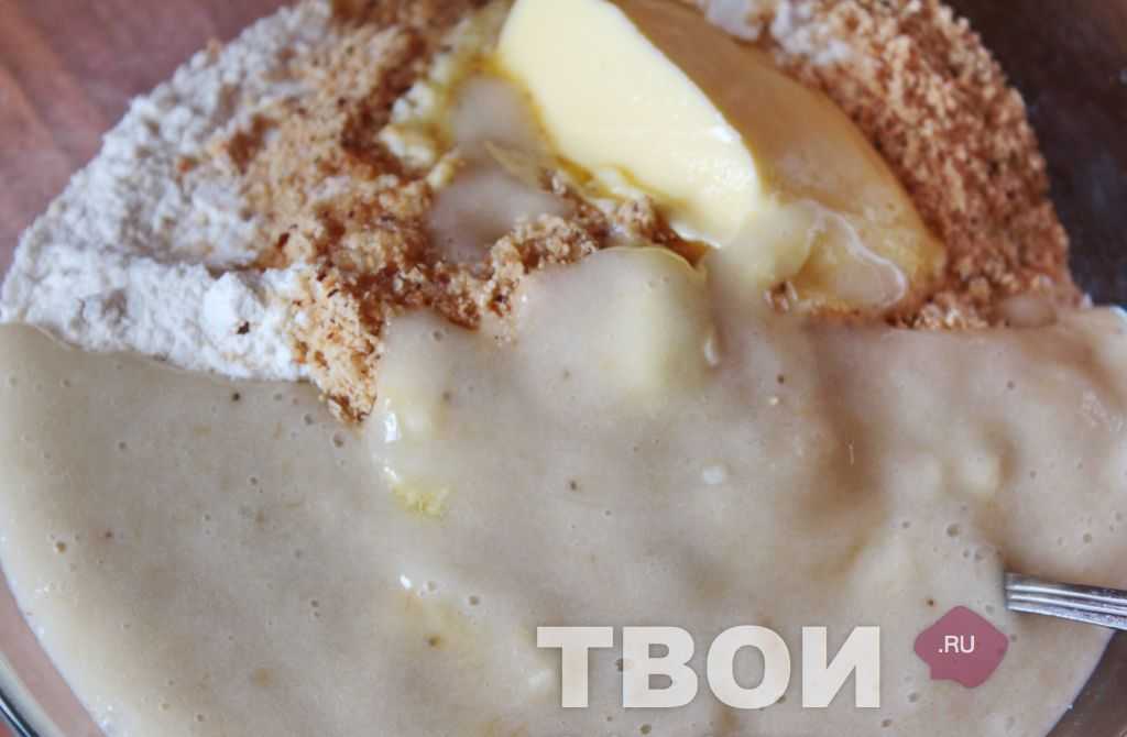 Добавить муку, вмешать в тесто.