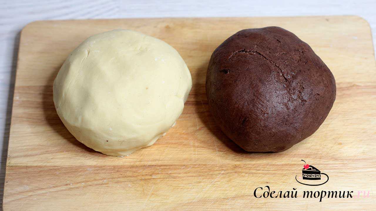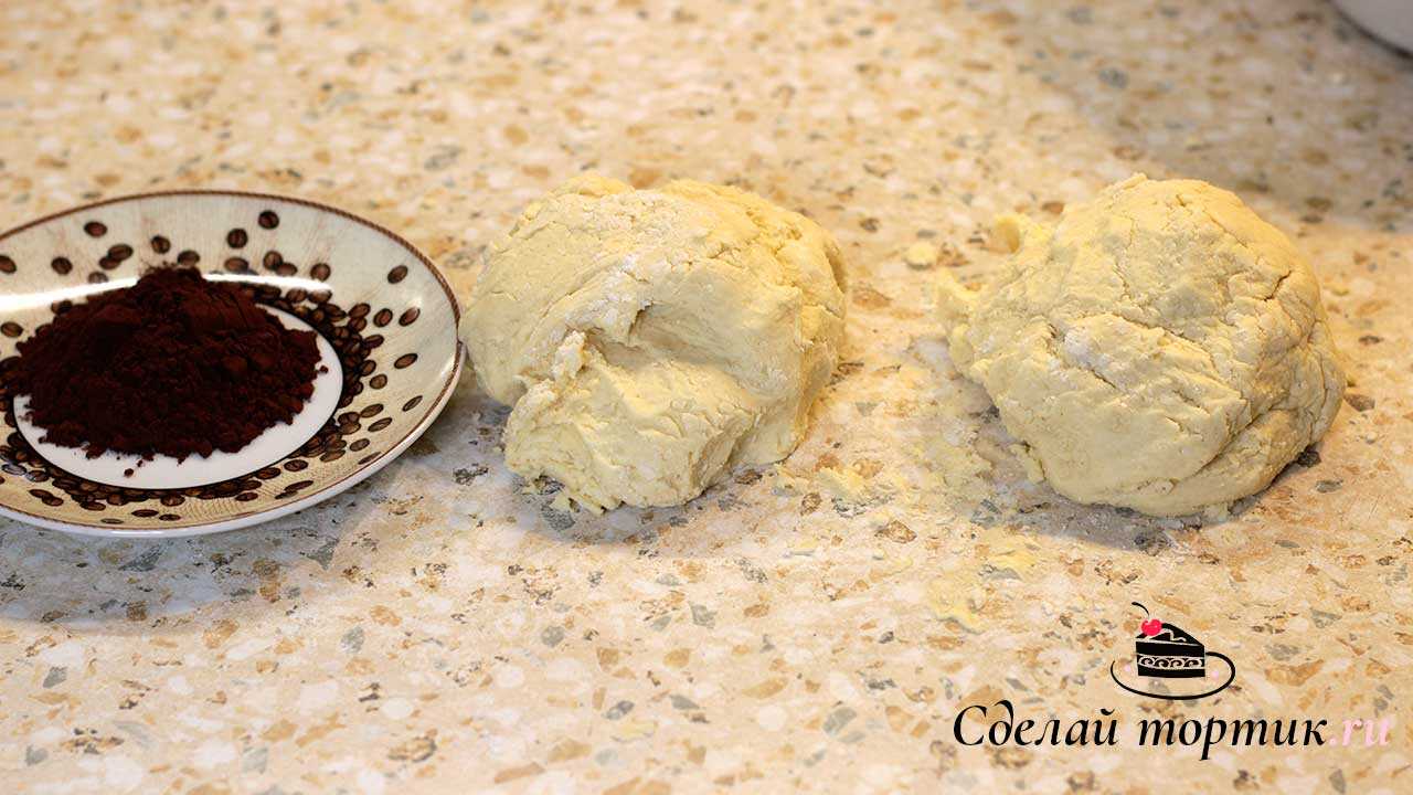 - Замесив тесто, его нужно разделить на 2 части, вмешав в одну из них какао-порошок.