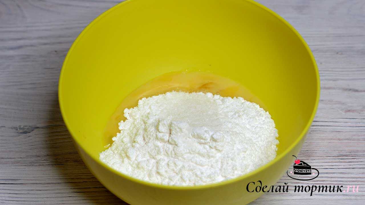 - Муку с разрыхлителем высыпать через сито в емкость с взбитой массой. Нужно быстро замесить тесто с помощью ложки. Долго месить его не надо, потому как оно станет жестким.