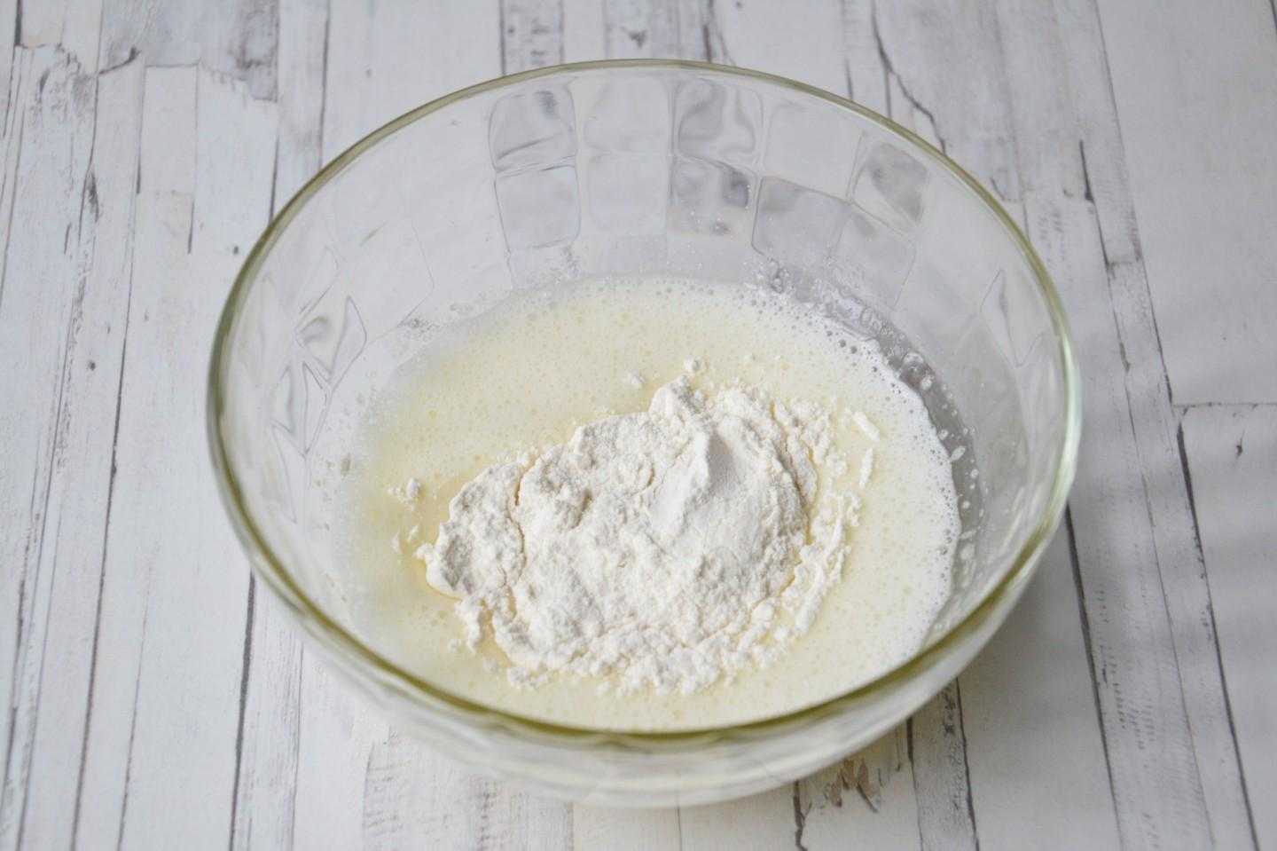2. Размягченный маргарин добавьте к просеянной муке, а затем отделите яичные белки от желтков и добавьте желтки к муке и маргарину. Выложите в смесь ингредиентов ложку сметаны.