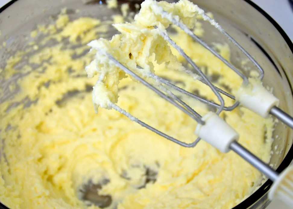 1. Сливочное масло либо сливочный маргарин нужно оставить при комнатной температуре приблизительно на полчаса. Размягченную жирную основу нужно взбить при помощи миксера в пышную кремовую массу.