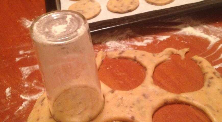 6. Из подготовленного песочного теста вырежьте печенье при помощи разных формочек или чашки. Также вы можете просто отщипывать равные кусочки теста, а не вырезать. После этого расстелите по противню пекарскую бумагу и переложите на нее печенье. Духовой шкаф включите разогреваться до 180 градусов.