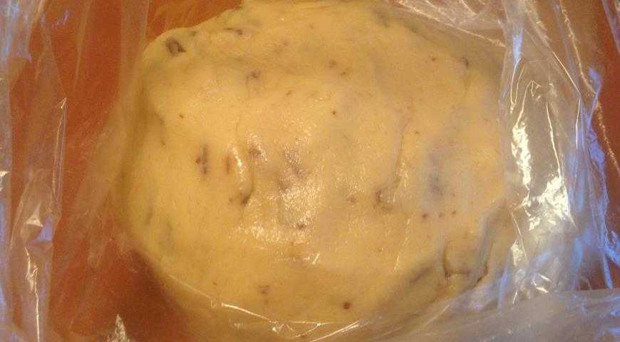 3. Из всех ингредиентов в миске руками замесите тесто, которое должно быть однородным и гладким. Сформируйте из теста шар и уберите его под пленку в холодильник минут на 20-30.