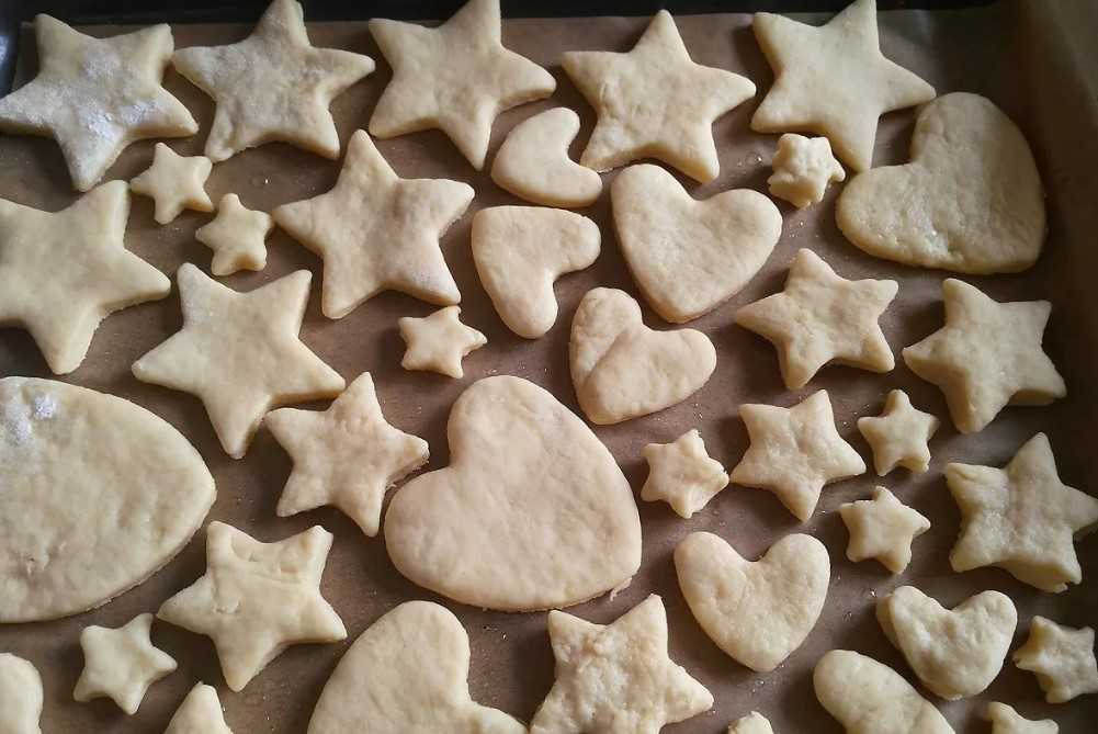 6. Из теста вырежьте печенье, воспользовавшись чашкой или формочками для резки печенья. Положите печенье на пекарскую бумагу, которую, в свою очередь, положите на противень в горячую духовку.