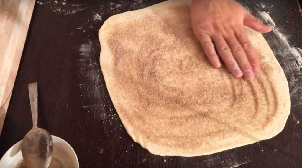 5. Слегка присыпьте рабочую зону мукой и положите туда тесто. Раскатайте песочное тесто при помощи скалки в пласт, на толщину пять миллиметров.