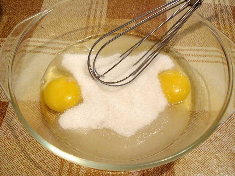 2. Куриные яйца соедините с сахарным песком, ванильным сахаром и взбейте до образования пышной пены, а затем постепенно добавляйте кубики подтаявшего маргарина и продолжайте взбивать смесь ингредиентов.