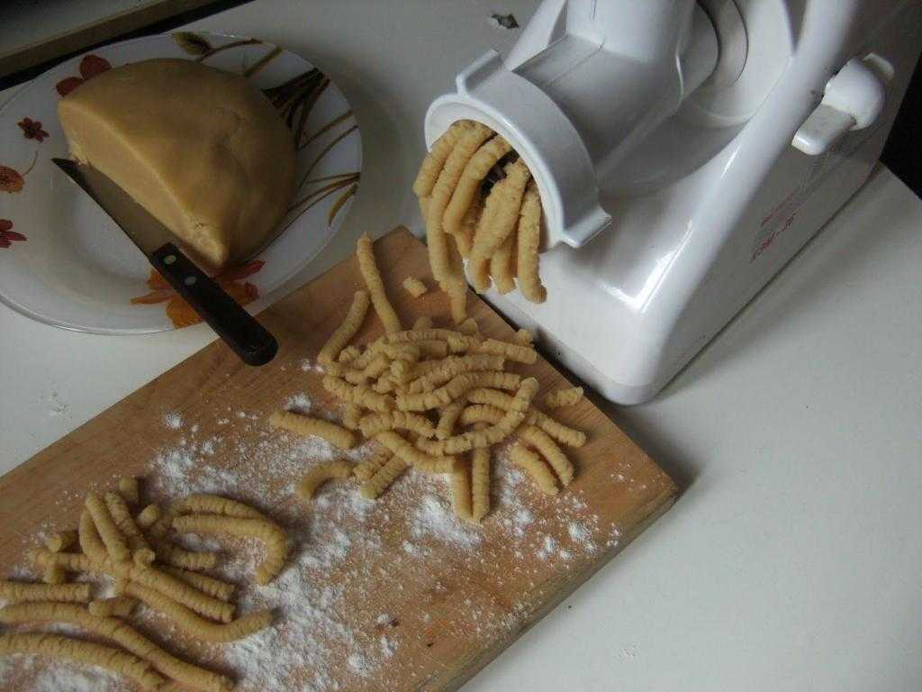 4. Возьмите обыкновенную мясорубку без ножа и положите туда тесто. Пропустите его через крупную решетку и получите гору червячков из теста.