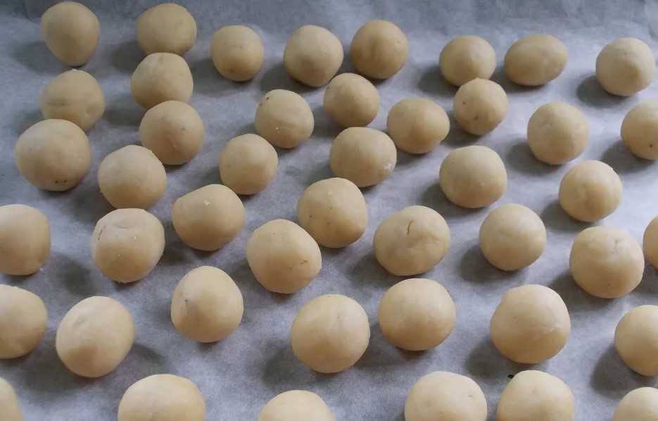 4. Тесто можете распределить в кондитерский шприц, либо разделить его на небольшие шарики небольшого размера. Шарики положите на пекарскую бумагу и приплюсните печенье, чтобы получились пышные кружочки.