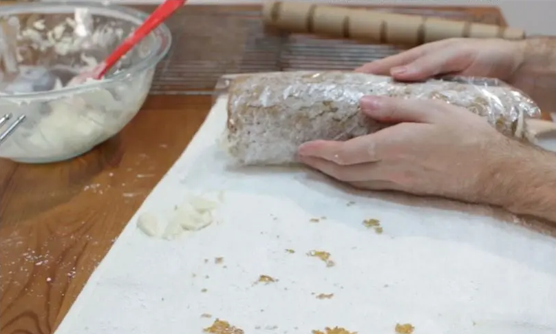 Полотно сверните в рулет, полностью обмотайте пищевой пленкой, загрузите в холодильник на 2 часа или в морозильный отсек на 30 минут.