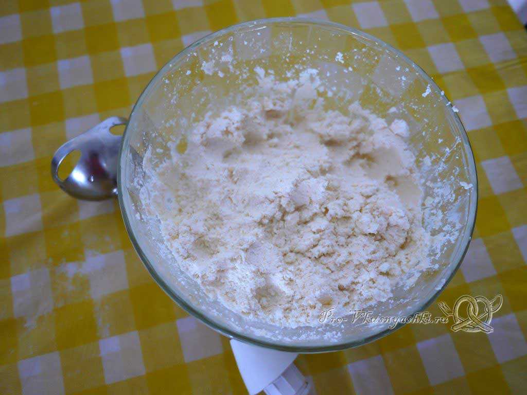 В мучной крошке делаем лунку, вливаем сметанную смесь и быстро замешиваем тесто. Долго месить тесто не нужно, замешиваем его как можно быстрее. Основная задача – добиться однородности, этого будет вполне достаточно. И поскольку мука везде разная, то в ходе замеса вам может понадобиться добавить ещё немного муки, если вдруг тесто получается очень мягким и липким. Заворачиваем тесто в пищевую плёнку и отправляем на час в холодильник.