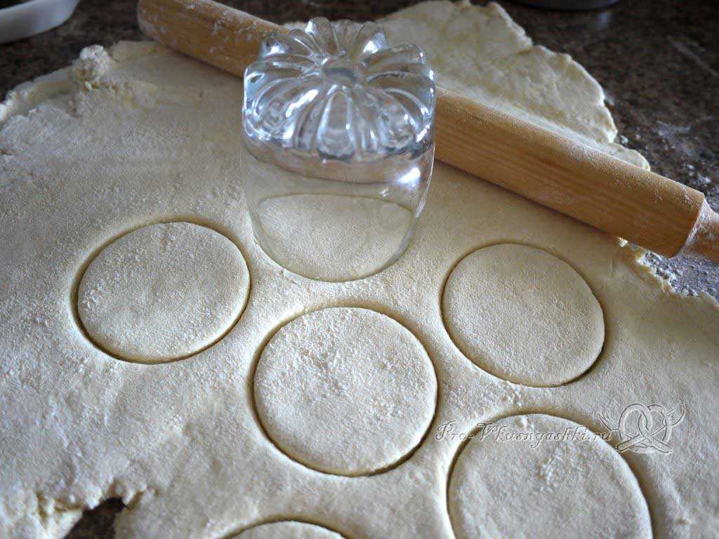 Посыпьте разделочную поверхность мукой, выложите творожное тесто и раскатайте в пласт толщиной 3-4 мм. С помощью тонкостенного стакана диаметром 7-8 см вырежьте кружки (в зависимости от толщины у вас получится 16-18 штук печенья, 12 после первого раскатывания, и еще 4-6 из обрезков).