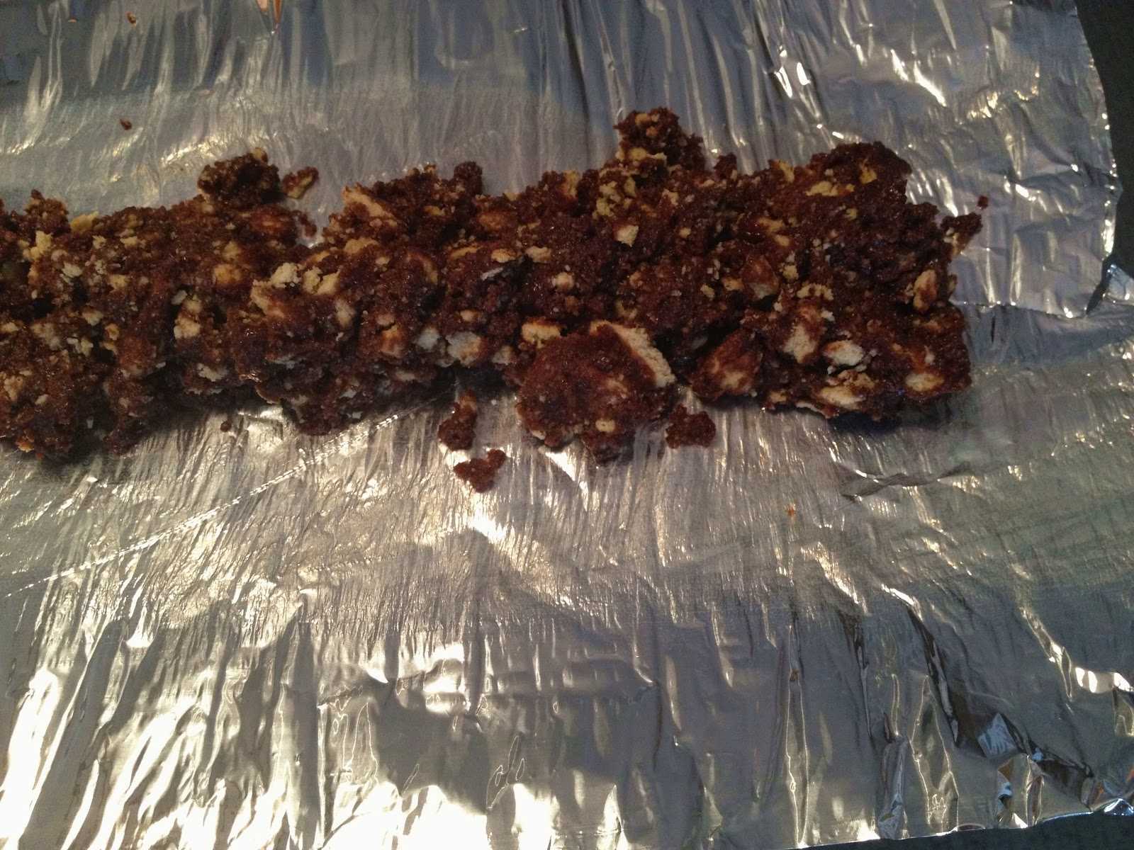 - Горячей шоколадной смесью заливаем раздробленное печенье с орехами.