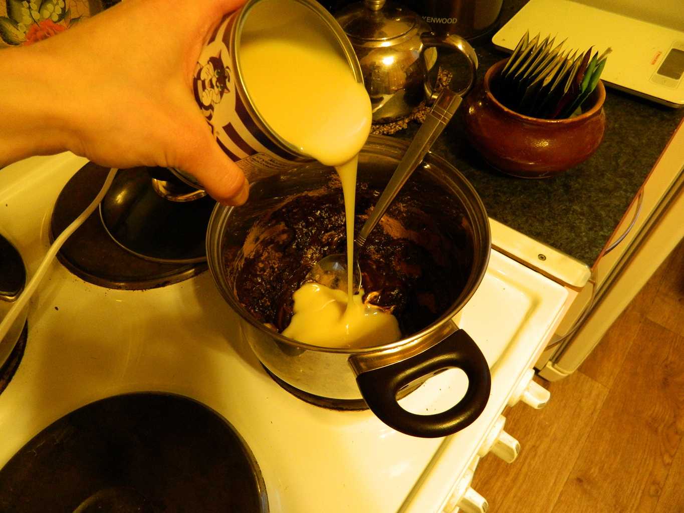 - В конце вливаем сгущенное молока, перемешиваем и убираем с плиты.