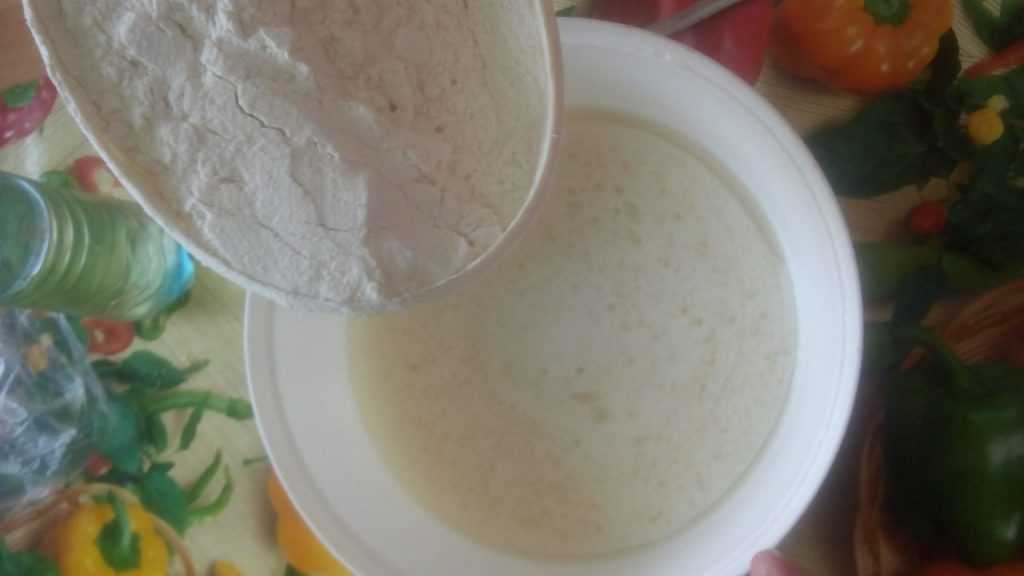 Во время реакции рассола с содой (видна пена на фото) высыпаем понемногу муку. Стакан муки высыпали — помешали, и еще, и еще.