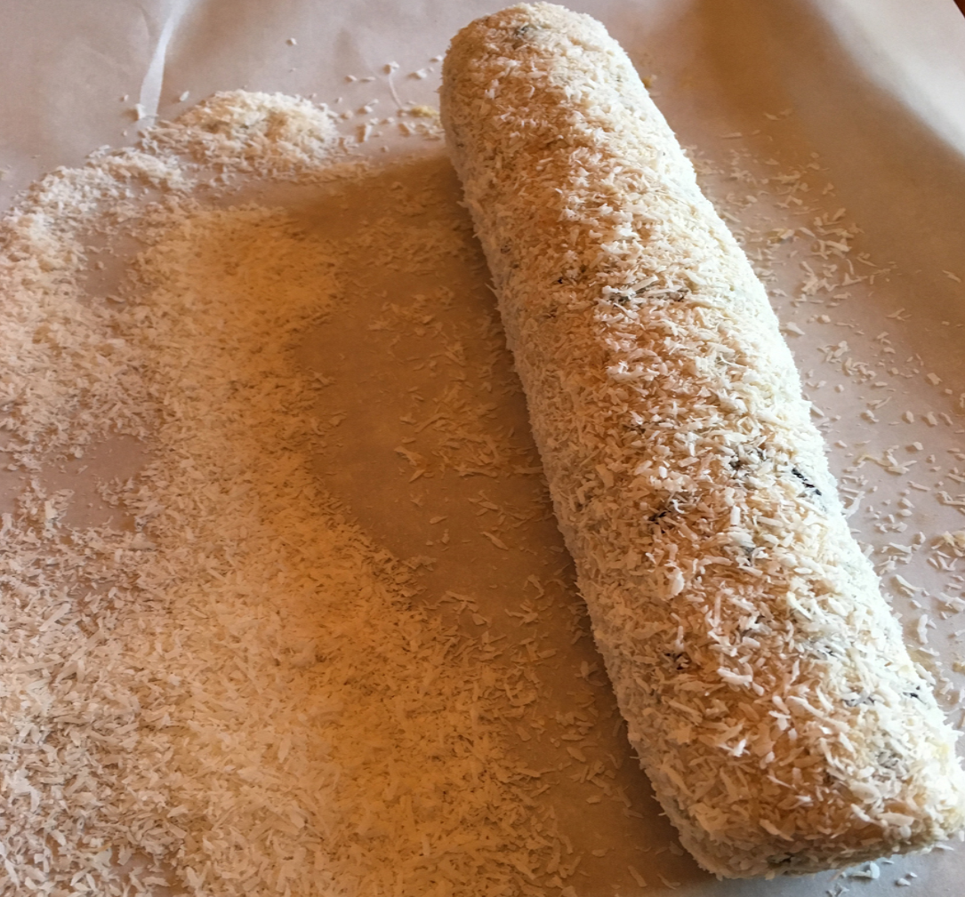 - На пергаментной бумаге аккуратно формирую колбаску. Заворачиваю в плёнку, чтобы не обветрела. Перекладываю на широкую тарелку и убираю в холодильник на 6-7 часов.
