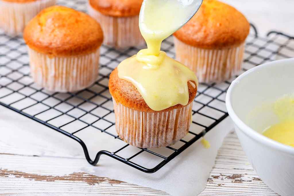 - Нанесите сливочную глазурь тонким слоем на поверхность остывших маффин и оставьте до застывания. Можно слой глазури посыпать разноцветной присыпкой.