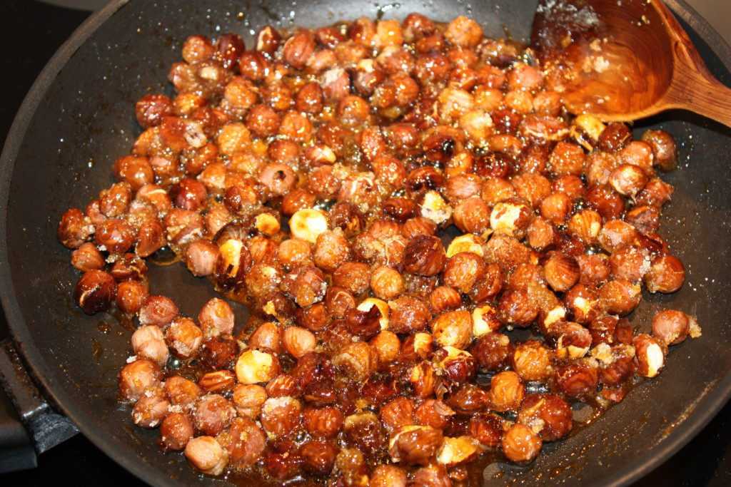 Добавьте обжаренный и очищенный от шелухи фундук в карамель.