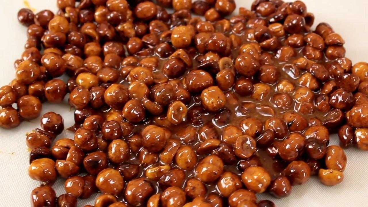 - Заранее разложите на плоской поверхности пищевой пергамент и переложите на него орехи в карамели. Пускай сладость остынет.
