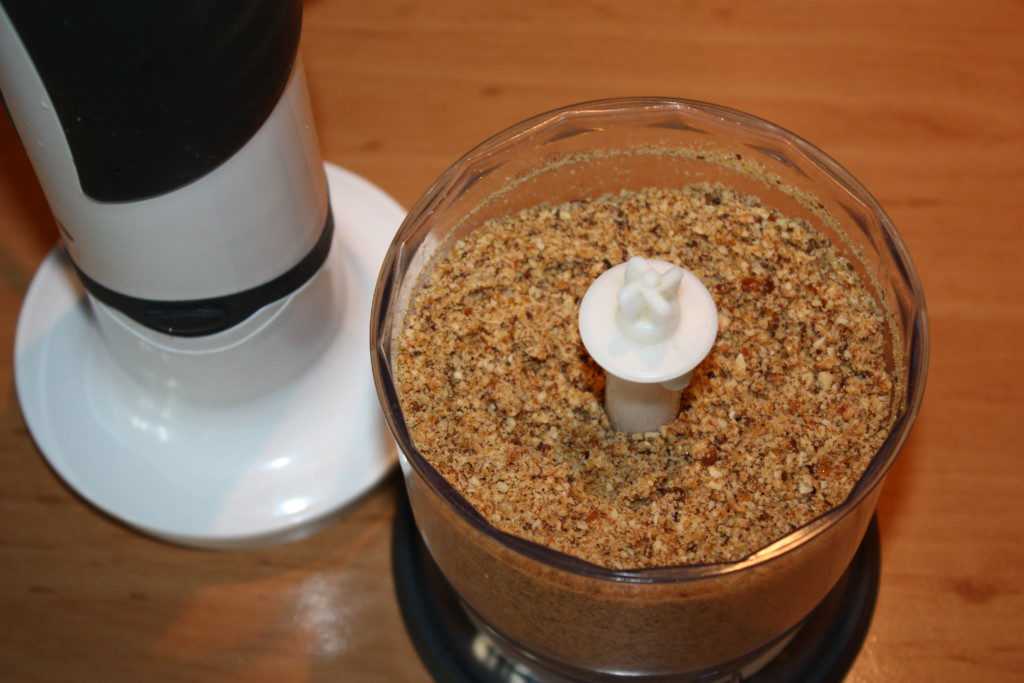 Измельчите ореховую массу. Вначале получается крупная крошка.