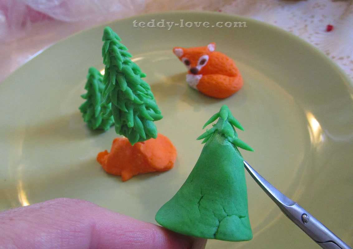 Лисичка — это треугольник и овал с хвостом. Грибы — ножка с приплюснутым шариком (лепила в основном дочка, детсад вам в помощь). Елки делала из треугольника из мастики с помощью маникюрных ножниц: